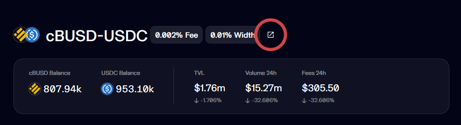 <figure><img src="https://3522878855-files.gitbook.io/~/files/v0/b/gitbook-x-prod.appspot.com/o/spaces%2F1irpxOULWWoYXAKrwP4H%2Fuploads%2F4t32oRvQXlL5QqJKy6qr%2Fcontractlink.png?alt=media&#x26;token=a163301b-68a4-4f9d-b5af-e16fd1133e34" alt=""><figcaption><p>Click this icon to find the contract address for a pool or boosted position.</p></figcaption></figure>